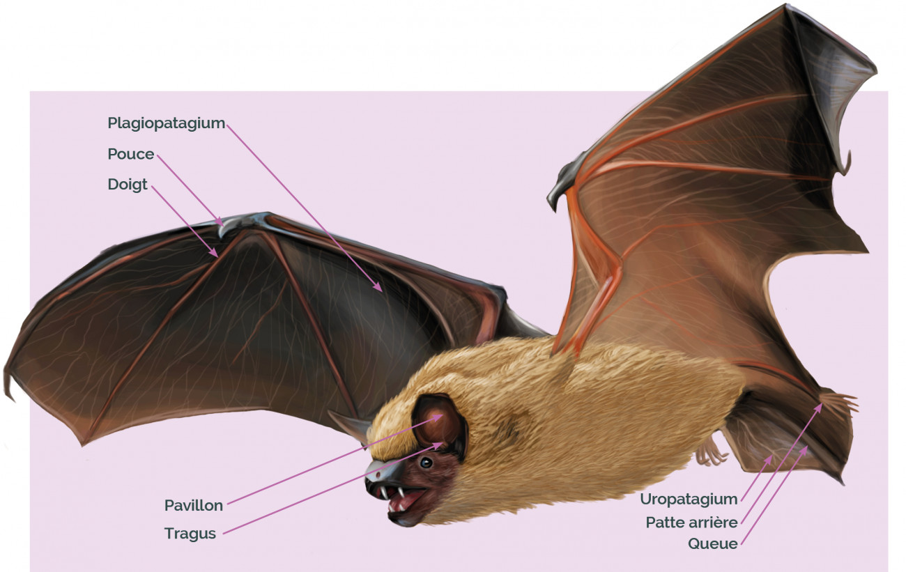 Le vol des chauves-souris est rendu possible par une modification des membres antérieurs, comme pour les oiseaux. Les chauves-souris ne volent pas grâce à des plumes mais grâce à des membranes constituées de peau et de muscles appelées patagiums. Suivant sa position sur le corps de l’animal, le patagium porte un nom différent. L’aile des chauves-souris, le plagiopatagium, relie leurs doigts très allongés (excepté le pouce) à leur corps. Chez toutes les espèces d’Europe, l’uropatagium, relie également les membres postérieurs et la queue, contribuant ainsi au vol et pour certaines espèces, à la capture des proies.