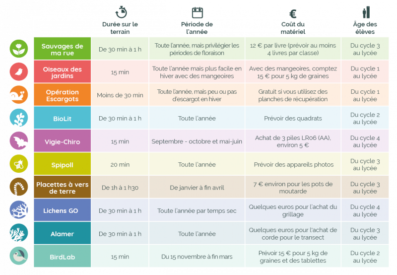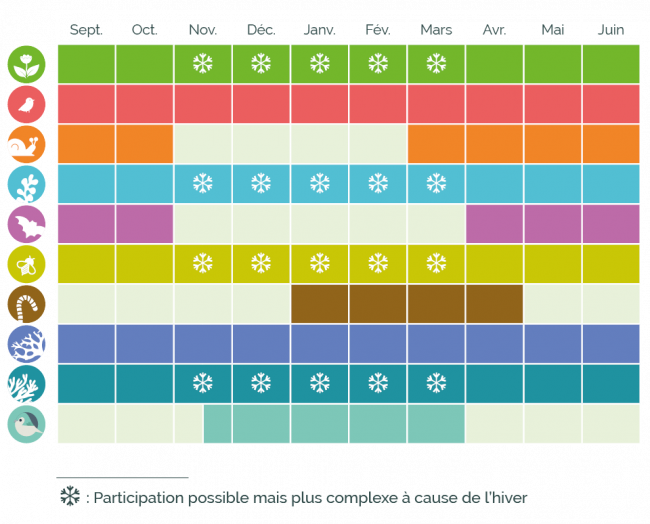 Ce calendrier vous permettra de savoir en un coup d'œil quelles sont les périodes d'observations pour les différents protocoles. Les flocons, du mois de décembre au mois de février, signifient que la participation à l'observatoire concerné est possible mais plus complexe à cause de l'hiver (par exemple pour Sauvages de ma rue, les plantes encore vivantes sont souvent plus difficiles à déterminer en hiver).