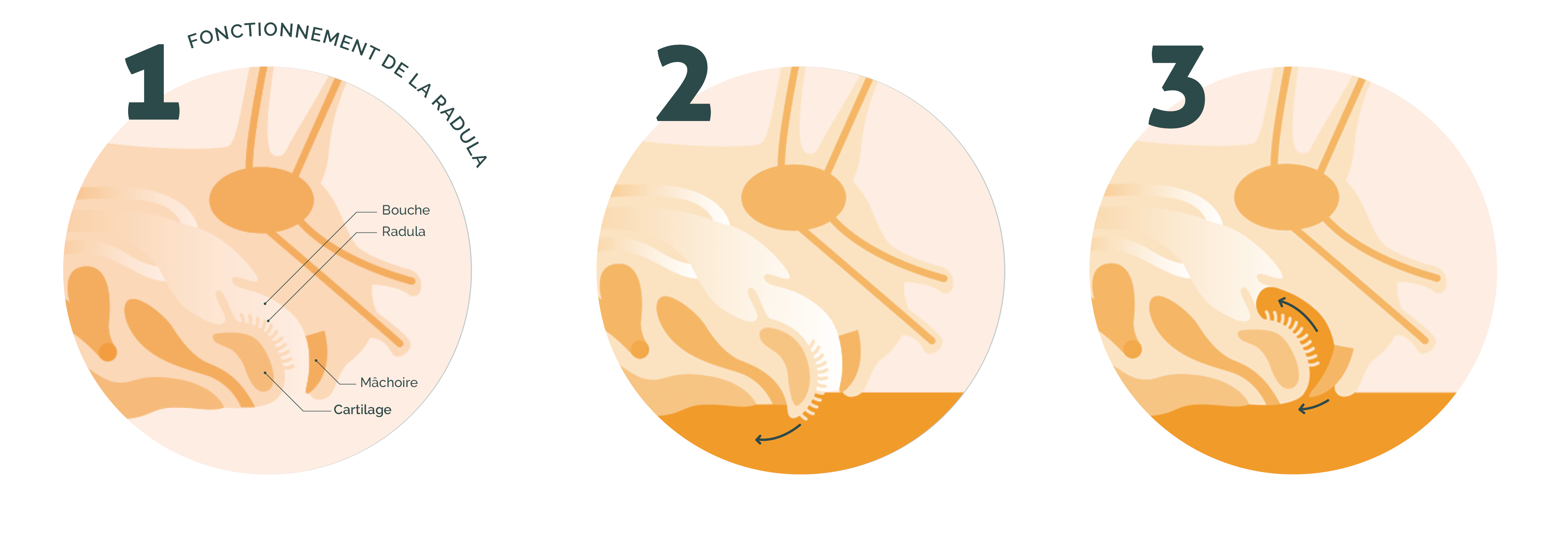 Les escargots et les limaces s’alimentent en râpant leur nourriture grâce à une plaque calcaire ressemblant à une langue dentée appelée radula. Après être entrés par la bouche, les aliments passent dans le jabot où ils sont mélangés à de la salive. La nourriture passe par l’estomac puis jusqu’à une glande digestive (ces organes se trouvent dans la coquille).