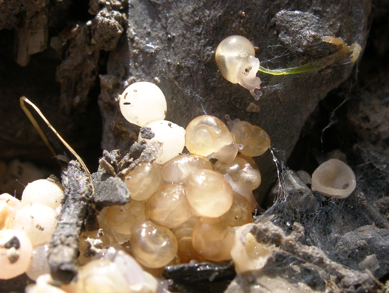 15 à 20 jours après l’accouplement, limaces et escargots creusent un trou dans le sol (entre la surface et environ 10 cm de profondeur) pour y pondre leurs œufs. Chaque portée peut contenir jusqu’à 100 œufs pour les escargots et 500 pour les limaces. L'ensemble des œufs s'appelle un naissain. La durée avant l’éclosion varie en fonction de la température (de trois semaines lorsque les températures sont favorables, jusqu’à trois mois). Selon les espèces, escargots et limaces pondent entre une fois par mois et une fois par an (vous trouverez de nombreuses photos en suivant ce lien).